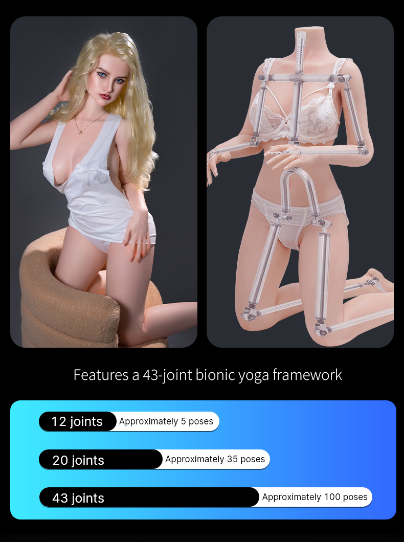 Her internal stainless-steel skeleton provides realistic flexibility, allowing lifelike motion and posture that respond naturally to your touch.
